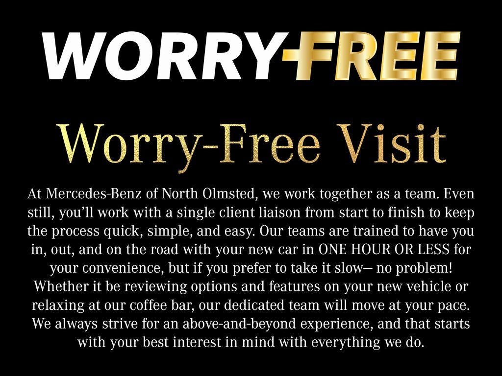 At Mercedes-Benz of North Olmsted, we're transforming the dealership experience. Our Worry-Free Pricing ensures a hassle-free process no pressure, no games just transparent, market-based pricing from the start, giving you complete confidence while you shop.